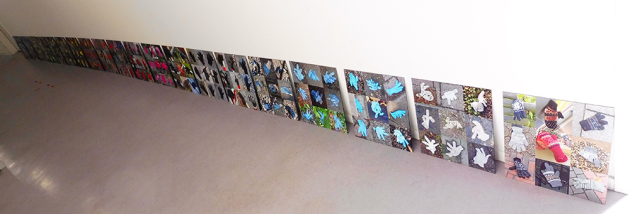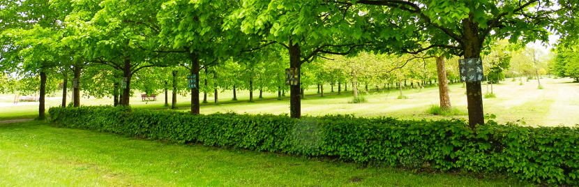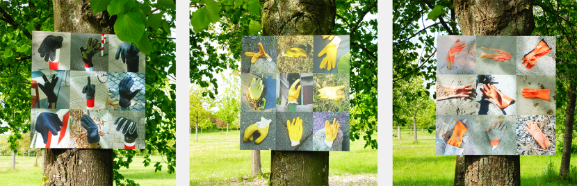 179 Fotos von verlorenen Handschuhen, aufgehoben in 20 Collagen (Digitaldruck auf Alu Dibond) in der temporären "Galerie unter den Linden" im Arboretum Thedinghausen.